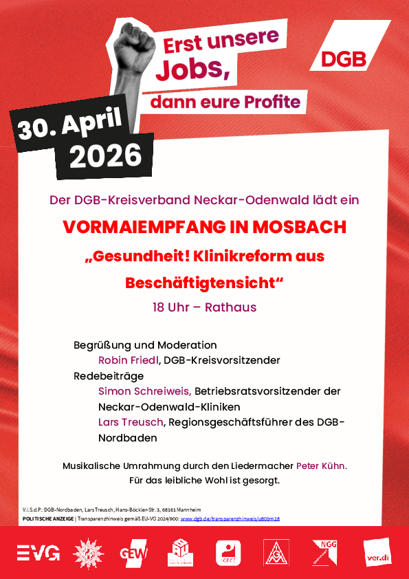 zum Tag der Arbeit möchten wir euch herzlich zur Demo in Sindelfingen einladen. Um 11:00 Uhr beginnt der Demozug am Sindelfinger Marktplatz. Die Kundgebungen folgen um 11:30 am ebenda.